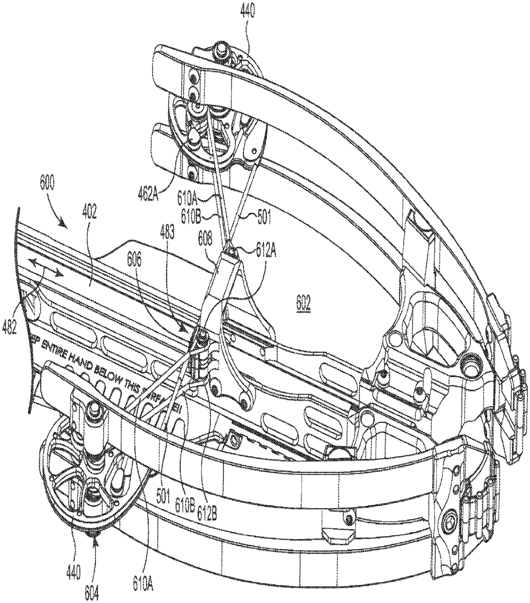 A crossbow string guides that include upper and lower helical power cable journals on opposite sides of a draw string journal. A separation between first and second axis of the string guides in a drawn configuration is about 5 inches to about 10 inches and the draw string in the drawn configuration comprises an included angle of less than about 25 degrees. First and second pairs of power cables wrap and unwrap at least 300 degrees around, the respective first and second upper and lower helical power cable journals as the draw string moves between a released configuration to a drawn configuration.