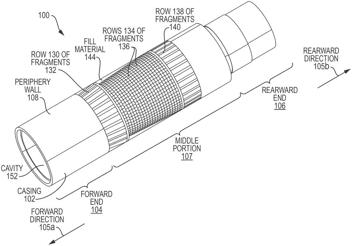 A warhead includes a casing having a periphery wall that extends along a central axis from a forward end of the casing to a rearward end of the casing. The casing defines a cavity configured to contain an explosive material, wherein the forward end of the casing includes a first thread pattern configured to engage a guidance system casing, and the rearward end of the casing includes a second thread pattern configured to engage a propulsion system casing. A first row of fragments is arranged along a first section of the periphery wall of the casing. A plurality of second rows of fragments is rearward of the first row of fragments and arranged along a second section of the periphery wall of the casing. In an example, each of the first and second sections tapers inward towards the central axis as it extends toward the forward end of the casing.