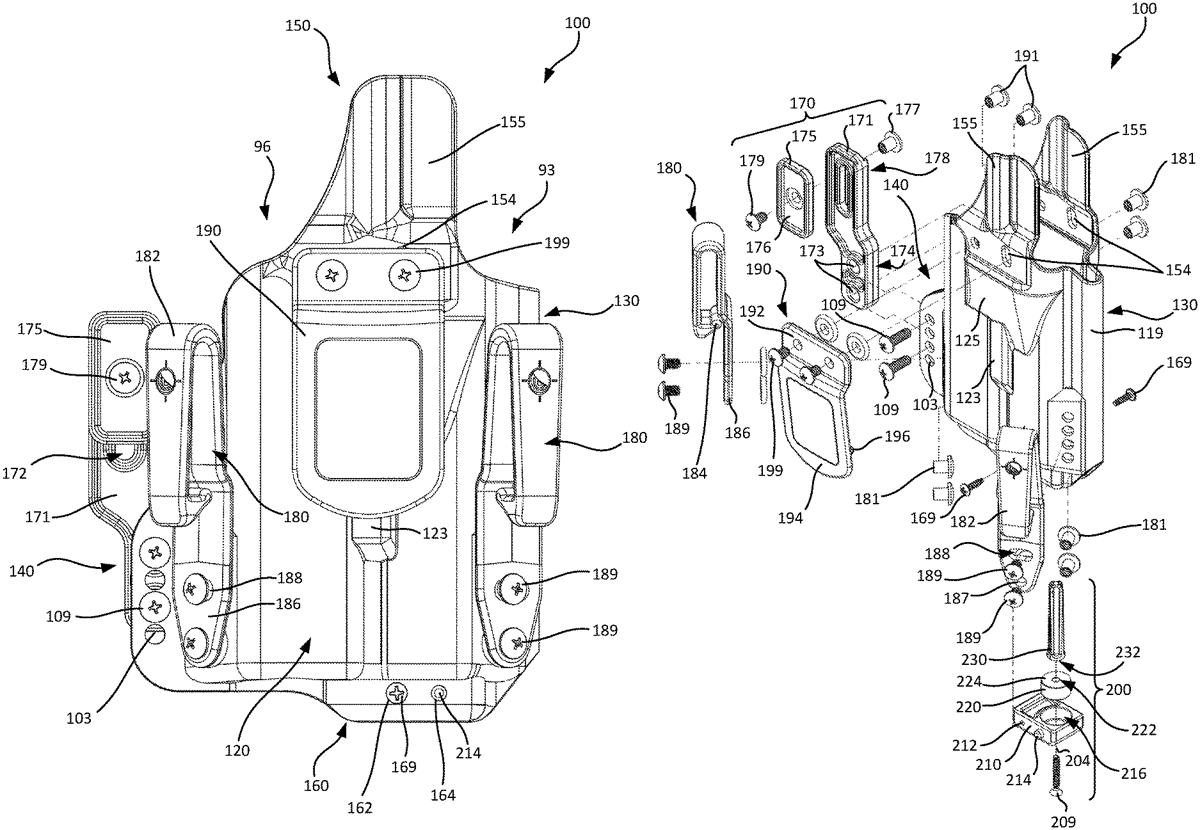 The patent describes a firearm holster featuring an outer wall that defines a cavity for receiving a firearm, with a magnet assembly positioned at the muzzle end to enhance retention. Additionally, the holster includes a protruding wedge and a spacer assembly designed to improve comfort and stability when worn by a user.