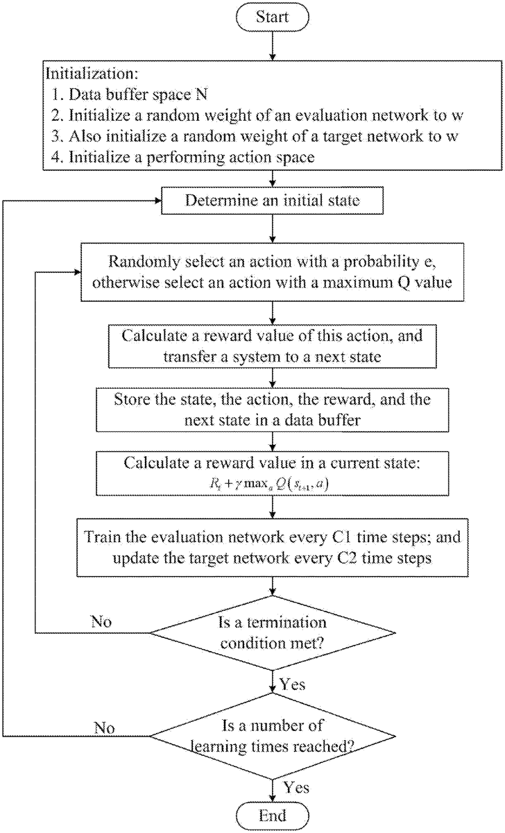 - A method for designing a terminal guidance law based on deep reinforcement learning, comprising the following steps: establishing a relative kinematics equation between a missile and a target in a longitudinal plane of a target interception terminal guidance section of the missile; abstracting a solving problem of the kinematics equation and modeling as a Markov decision process; building an algorithm network, setting algorithm parameters, and training the algorithm network based on a randomly initialized data set to determine weight parameters of an initial network; continuously caching, by an agent, state transition data and reward values as learning samples in an experience pool based on a Q-Learning algorithm, and continuously selecting a fixed number of samples from the experience pool to train the network until set learning rounds are reached; and generating, during a specific guidance process, an action in real time based on a current state by using a learned network to transfer to a next state, and continuously repeating the process until the target is hit to complete the guidance process. establishing a relative kinematics equation between a missile and a target in a longitudinal plane of a target interception terminal guidance section of the missile; abstracting a solving problem of the kinematics equation and modeling as a Markov decision process; building an algorithm network, setting algorithm parameters, and training the algorithm network based on a randomly initialized data set to determine weight parameters of an initial network; continuously caching, by an agent, state transition data and reward values as learning samples in an experience pool based on a Q-Learning algorithm, and continuously selecting a fixed number of samples from the experience pool to train the network until set learning rounds are reached; and generating, during a specific guidance process, an action in real time based on a current state by using a learned network to transfer to a next state, and continuously repeating the process until the target is hit to complete the guidance process.