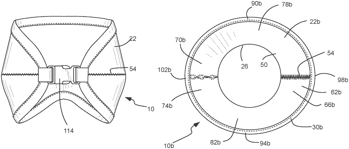The patent describes a removably attachable eyepiece shield designed for sporting optics, featuring a frusto-conical shell with an oblong eye opening that is non-parallel to the eyepiece hole. It includes a flexible laminate material with an intermediate foam layer and a fastener system that allows the shield to be configured in both open and closed states.