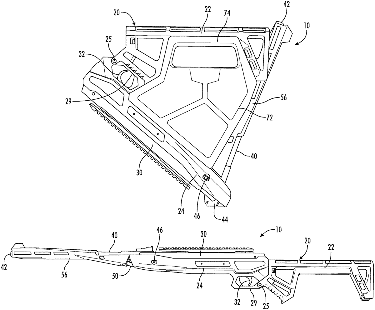 - A foldable break barrel air gun that is movable from a stowed configuration to a use configuration, the foldable break barrel air gun comprising: a stock including a butt stock pivotally connected to a forestock in which a firing engine is located; a barrel having a muzzle end and a breech end, the barrel being pivotally connected to the forestock proximate the breech end; a cocking linkage having a first portion that is pivotally connected to the barrel and a second portion that is held in at least one of connected or engaged position with the firing engine by a releasable linkage connection; wherein, with the releasable linkage connection in a released position and the second portion of the cocking linkage is disengaged from the firing engine, the butt stock is foldable relative to the forestock, and the barrel is foldable relative to the forestock such that the butt stock is attachable to the barrel proximate to the muzzle end in the stowed configuration. a stock including a butt stock pivotally connected to a forestock in which a firing engine is located; a barrel having a muzzle end and a breech end, the barrel being pivotally connected to the forestock proximate the breech end; a cocking linkage having a first portion that is pivotally connected to the barrel and a second portion that is held in at least one of connected or engaged position with the firing engine by a releasable linkage connection; wherein, with the releasable linkage connection in a released position and the second portion of the cocking linkage is disengaged from the firing engine, the butt stock is foldable relative to the forestock, and the barrel is foldable relative to the forestock such that the butt stock is attachable to the barrel proximate to the muzzle end in the stowed configuration.