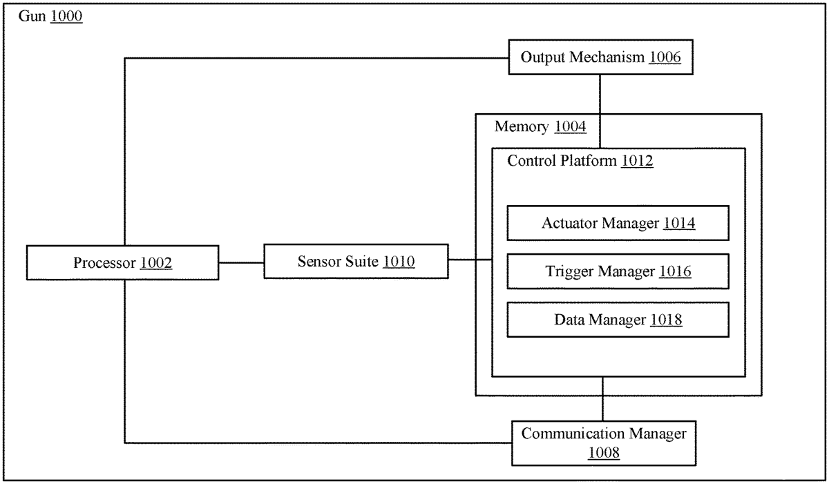 - A gun including a fire control mechanism capable of causing the gun to fire projectiles, the gun comprising: a barrel defining a bore axis; a firing component that is moveable between a first position and a second position; and an actuator that is configured to i) retain the firing component in the first position by default and ii) enable the firing component to move to the second position based on the actuator being displaced in a direction that is substantially perpendicular to the bore axis. a barrel defining a bore axis; a firing component that is moveable between a first position and a second position; and an actuator that is configured to i) retain the firing component in the first position by default and ii) enable the firing component to move to the second position based on the actuator being displaced in a direction that is substantially perpendicular to the bore axis.