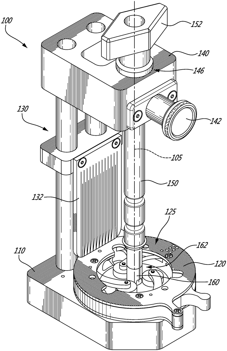 - A device for aligning and securing a projectile, comprising: a base defining a receptacle for receiving the projectile and comprising a self-centering mechanism for aligning a longitudinal axis of the projectile with a reference axis; an upstanding support projecting upwardly from the base; a head member extending from the upstanding support, disposed vertically above the base, and having defined therein an opening aligned with the reference axis; a rod member slidably mounted in the opening, such that a longitudinal axis of the rod member is aligned with the reference axis; and a mounting adapter having a first end configured for adhesively retaining the projectile and a second end defining a coupling mechanism selectively mateable with a distal end of the rod member and with an inspection device used for performing inspection of the projectile. a base defining a receptacle for receiving the projectile and comprising a self-centering mechanism for aligning a longitudinal axis of the projectile with a reference axis; an upstanding support projecting upwardly from the base; a head member extending from the upstanding support, disposed vertically above the base, and having defined therein an opening aligned with the reference axis; a rod member slidably mounted in the opening, such that a longitudinal axis of the rod member is aligned with the reference axis; and a mounting adapter having a first end configured for adhesively retaining the projectile and a second end defining a coupling mechanism selectively mateable with a distal end of the rod member and with an inspection device used for performing inspection of the projectile.