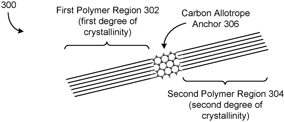 The patent describes a composite material for anti-ballistic applications that incorporates a carbon allotrope into the crystalline structure of ultra-high molecular weight polyethylene (UHMWPE), resulting in increased crystallinity and electrical conductivity. The fabrication method involves creating fibers from a mixture of polymer and carbon allotrope, with potential applications in monitoring the material’s condition and performance.
