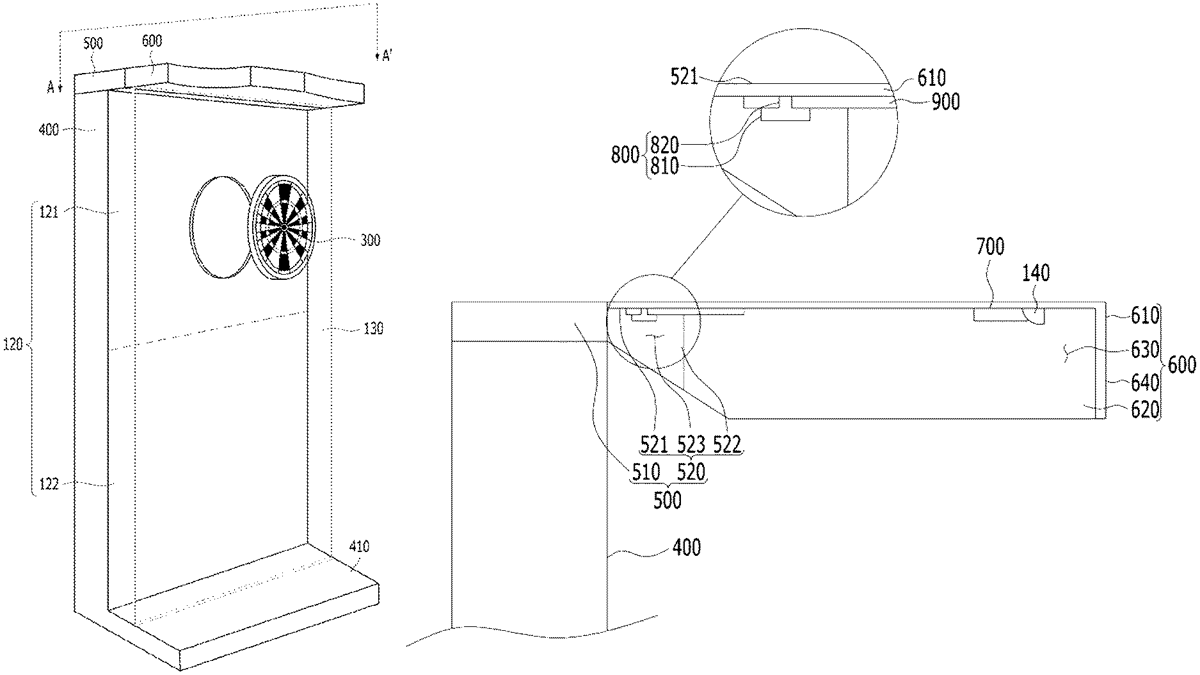 The patent describes a dart game apparatus featuring a body part with a dart target, a support unit with a coupling and extension unit, and a rotatable lid unit attached via hinges. Additionally, the support unit includes fixation units, while the lid has latch units designed to secure the lid in place.