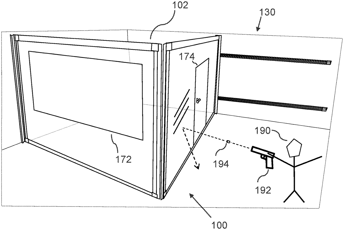 1 . A safety enclosure building system, comprising: a) a first wall panel, wherein a first outer vertical end of the first wall panel is configured to be rotatably mounted to a first wall; and b) a second wall panel, wherein a second outer vertical end of the second wall panel is configured to be slidably and rotatably mounted to a second wall; wherein the first wall panel and the second wall panel are each configured to prevent penetration of a projectile of a firearm; wherein a first inner vertical end of the first wall panel is rotatably connected to a second inner vertical end of the second wall panel; such that the safety enclosure building system is configured to be positioned in a folded-in configuration in a corner between the first wall and the second wall, such that the folded-in configuration permits space saving storage; and such that the safety enclosure building system is configured to be folded out to a folded-out configuration, such that the folded-out configuration can enable students to seek safety in a safe interior behind the safety enclosure building system. a) a first wall panel, wherein a first outer vertical end of the first wall panel is configured to be rotatably mounted to a first wall; and b) a second wall panel, wherein a second outer vertical end of the second wall panel is configured to be slidably and rotatably mounted to a second wall; wherein the first wall panel and the second wall panel are each configured to prevent penetration of a projectile of a firearm; wherein a first inner vertical end of the first wall panel is rotatably connected to a second inner vertical end of the second wall panel; such that the safety enclosure building system is configured to be positioned in a folded-in configuration in a corner between the first wall and the second wall, such that the folded-in configuration permits space saving storage; and such that the safety enclosure building system is configured to be folded out to a folded-out configuration, such that the folded-out configuration can enable students to seek safety in a safe interior behind the safety enclosure building system.