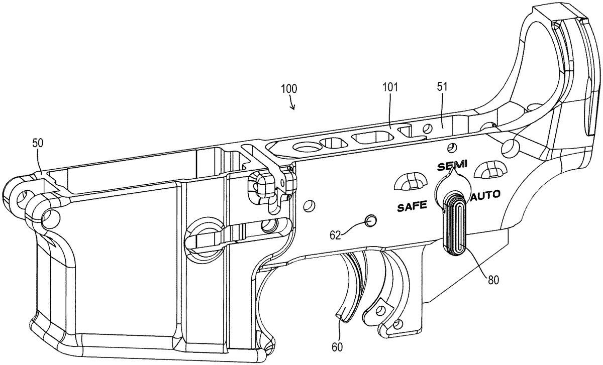 The patent describes a simulated trigger assembly for firearms that utilizes a magnet and a moveable portion to create a two-stage fire control simulation. In its initial configuration, the magnet is adjacent to the moveable portion, which separates in the simulated fired configuration.
