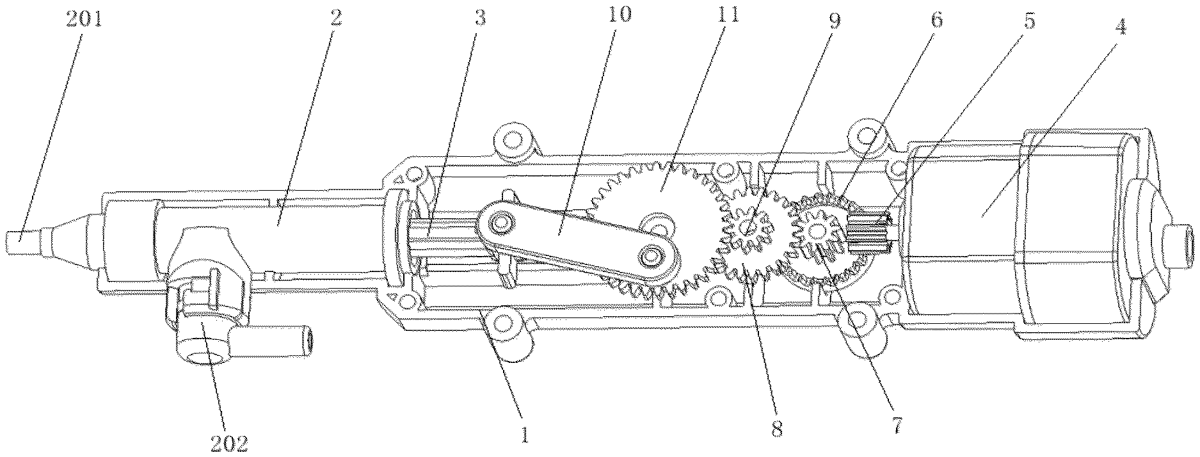 The patent describes a water spray structure for a continuous shooting toy water gun that includes a housing, water spray chamber, nozzle, and an electric motor driving a piston via a swinging mechanism. This design allows for an integrated unit that efficiently draws water from a storage chamber and sprays it continuously.