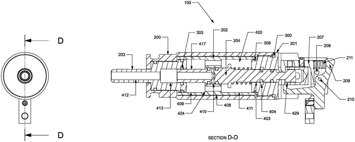 The patent describes a pneumatic projectile launching system featuring a movable nozzle that controls projectile passage and a valve mechanism that regulates airflow into and out of a volume chamber. The design includes dual sears that manage the valve’s position, ensuring precise control over the filling and exhaust states.