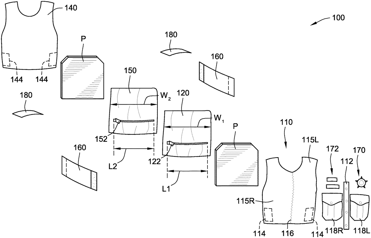 The patent describes a customizable vest cover kit that includes separate components such as front and back covers, linings, epaulets, and side straps, allowing users to personalize their vests. Each lining features pre-installed closure mechanisms for inserting additional inserts, enhancing the vest’s functionality and adaptability.
