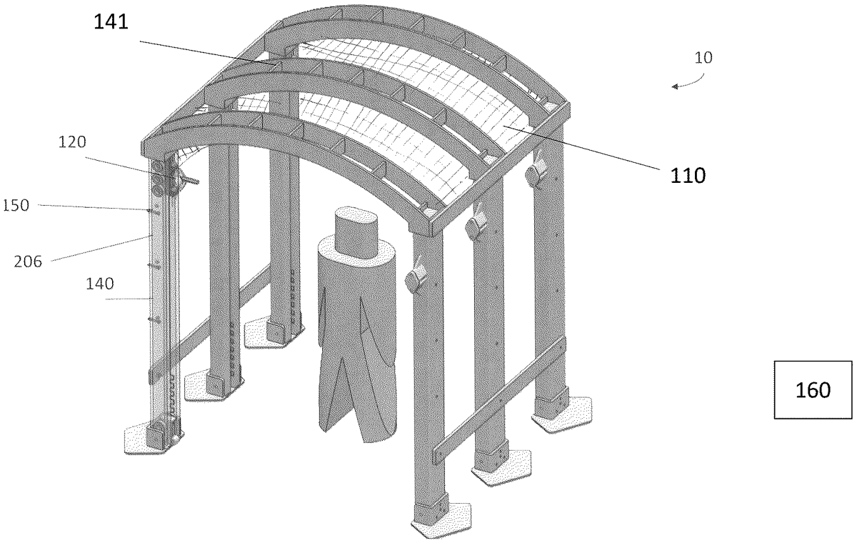 The patent describes a security system that utilizes a netting mechanism to apprehend suspects by deploying a heavy-duty net from a trolley system along a rail. This system is designed to be triggered to immobilize individuals at points of entry or exit until law enforcement arrives.