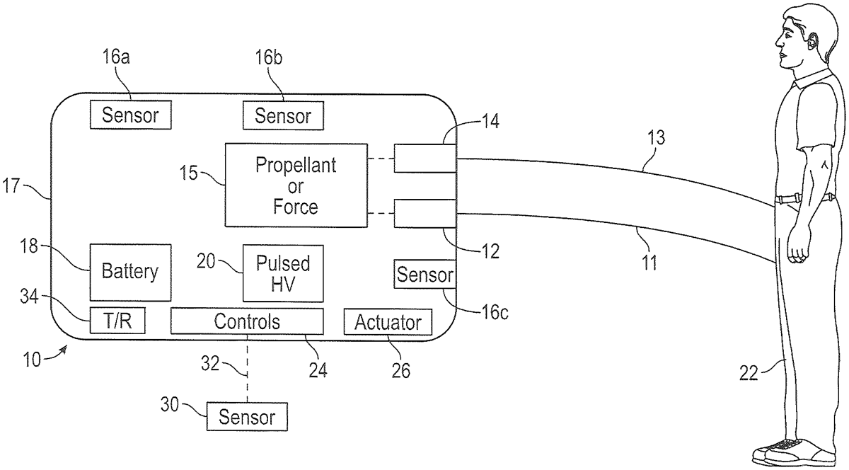 The patent describes a method for a conductive energy weapon (CEW) that utilizes sensors to assess the threat level of a situation before delivering an electric charge to a target via electrode wires. The electric energy applied is proportional to the assessed threat, allowing for a more measured response in various scenarios.