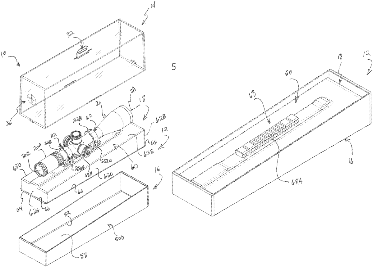 The patent describes a specialized packaging for optical sighting devices, such as telescopic sights, that allows users to view the device through a cover while maintaining alignment with the sighting axis. The packaging includes a base with a mount that imitates a portion of a firearm, providing support for the sighting device.