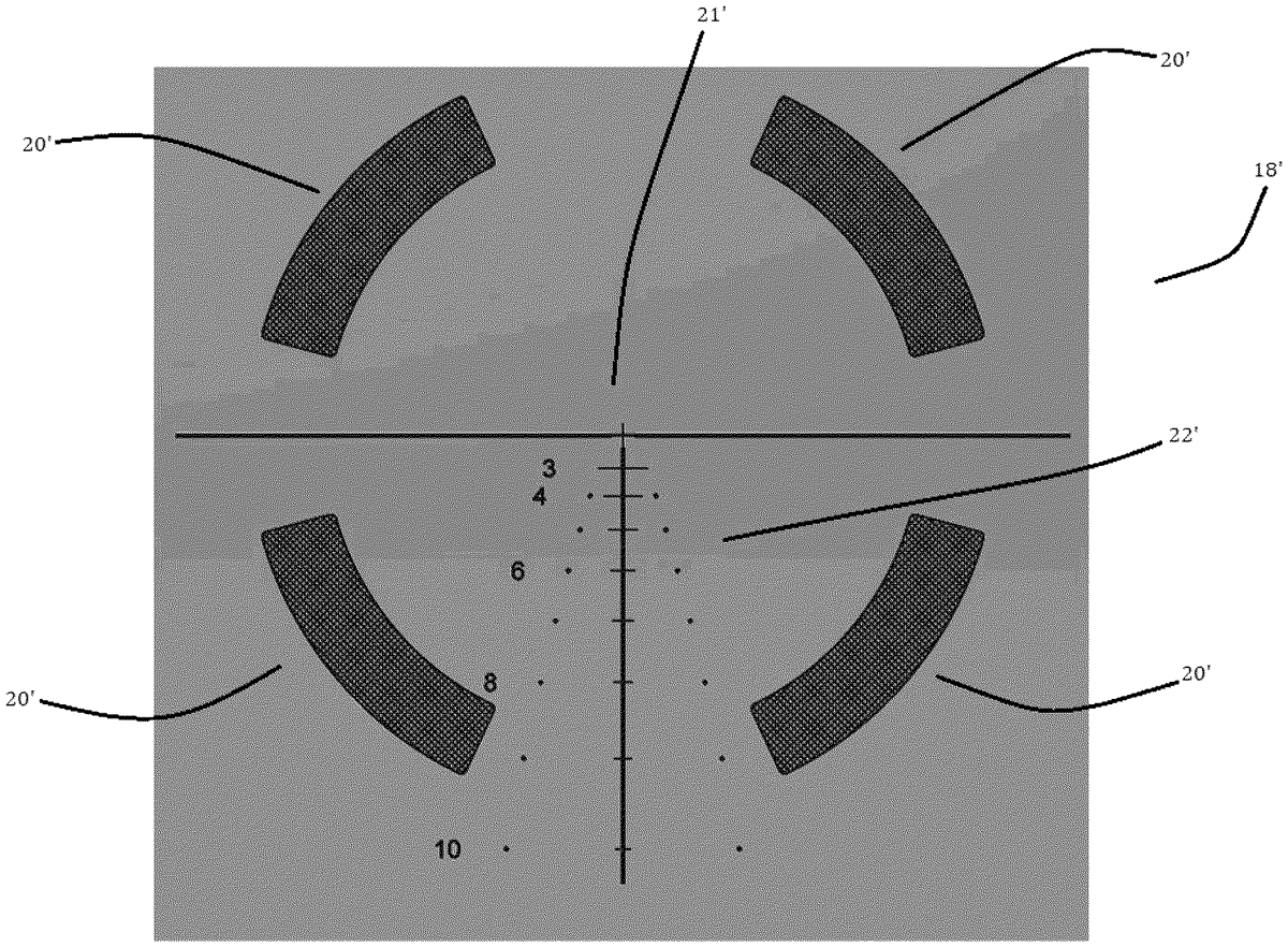 The patent describes a reticle for viewing optics that features a primary marking with etched patterns that appear solid at low magnification and translucent at high magnification. It may also include additional features like center dots and estimation tools for range and wind effects.