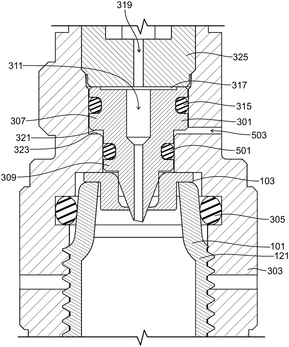 The patent describes a spring-loaded piercing mechanism designed for a pressurized gas vessel with a recessed membrane, featuring an inner housing that controls the vessel’s movement and an outer housing that allows for selective piercing of the membrane by a pin. The mechanism includes a biasing member that prevents the pin from contacting the membrane until the inner housing is slidably adjusted to compress the biasing member, enabling the piercing action.