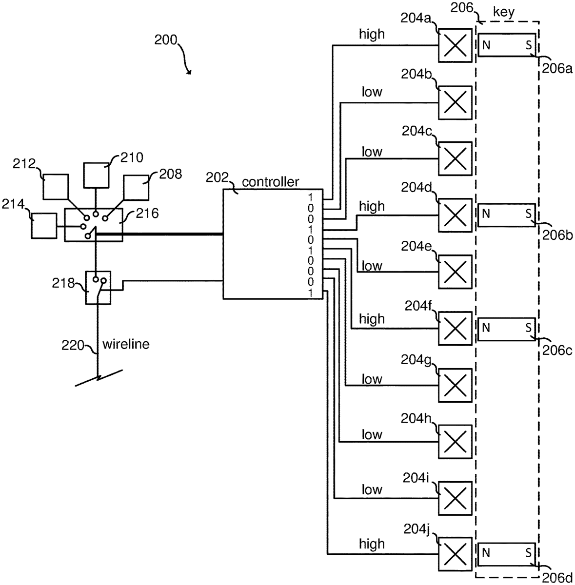 1 . An interlock system comprising: (a) a first electrically controllable switch having at least two positions; (b) a second electrically controllable switch having at least two positions; (c) a magnet-sensor array comprising at least three magnet sensors arranged in a geometric array, wherein each magnet sensor has at least two states, each state corresponding to a unique electrical output; and (d) a controller electrically connected to the magnet-sensor array, to the first electrically controllable switch, and to the second electrically controllable switch; (e) wherein the controller is configured to: (i) determine a presence state of the magnet-sensor array by measuring, for each of one or more of the at least three magnet sensors, the electrical output of that magnet sensor; (ii) determine, based on the presence state of the magnet-sensor array, a presence-state position for the first electrically controllable switch; (iii) determine a presence-state electrical signal to provide to the first electrically controllable switch to set the first electrically controllable switch in the presence-state position; and (iv) provide the presence-state electrical signal to the first electrically controllable switch to set the first electrically controllable switch in the presence-state position. (a) a first electrically controllable switch having at least two positions; (b) a second electrically controllable switch having at least two positions; (c) a magnet-sensor array comprising at least three magnet sensors arranged in a geometric array, wherein each magnet sensor has at least two states, each state corresponding to a unique electrical output; and (d) a controller electrically connected to the magnet-sensor array, to the first electrically controllable switch, and to the second electrically controllable switch; (e) wherein the controller is configured to: (i) determine a presence state of the magnet-sensor array by measuring, for each of one or more of the at least three magnet sensors, the electrical output of that magnet sensor; (ii) determine, based on the presence state of the magnet-sensor array, a presence-state position for the first electrically controllable switch; (iii) determine a presence-state electrical signal to provide to the first electrically controllable switch to set the first electrically controllable switch in the presence-state position; and (iv) provide the presence-state electrical signal to the first electrically controllable switch to set the first electrically controllable switch in the presence-state position. (i) determine a presence state of the magnet-sensor array by measuring, for each of one or more of the at least three magnet sensors, the electrical output of that magnet sensor; (ii) determine, based on the presence state of the magnet-sensor array, a presence-state position for the first electrically controllable switch; (iii) determine a presence-state electrical signal to provide to the first electrically controllable switch to set the first electrically controllable switch in the presence-state position; and (iv) provide the presence-state electrical signal to the first electrically controllable switch to set the first electrically controllable switch in the presence-state position.