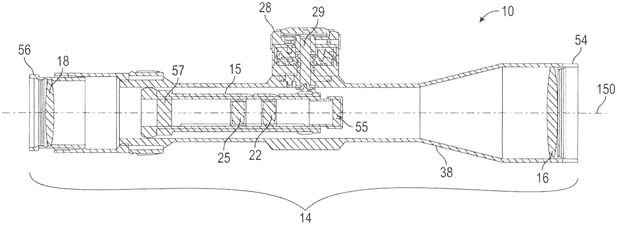 The patent describes a viewing optic designed with an active display and a mounting system for attaching enabler devices, featuring multiple enabler interfaces positioned strategically on the optic’s body. These interfaces include screw holes for secure attachment of enabler devices, enhancing the functionality of the viewing optic in targeting scenarios.
