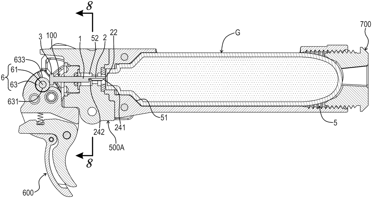 The patent describes a gas cylinder piercing mechanism for airguns that includes a housing with channels for gas flow, a piercing needle, and a trigger assembly. When the trigger is operated, the needle pierces a gas cylinder, allowing compressed gas to flow through the internal passage into the expansion channel and then to the gas supply channel.