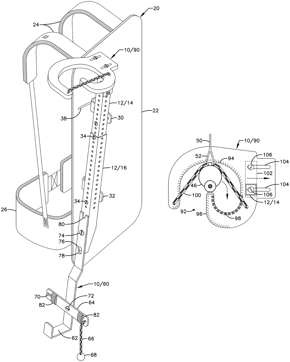 The patent describes a mounting device that allows a long gun to be securely attached to a backpack, enabling the user to easily remove and reattach the firearm without assistance or complex mechanisms. It features a rigid base with a horizontal surface for the gun’s butt, a grasping mechanism for the barrel, and an elastic restraint to keep the firearm in place.