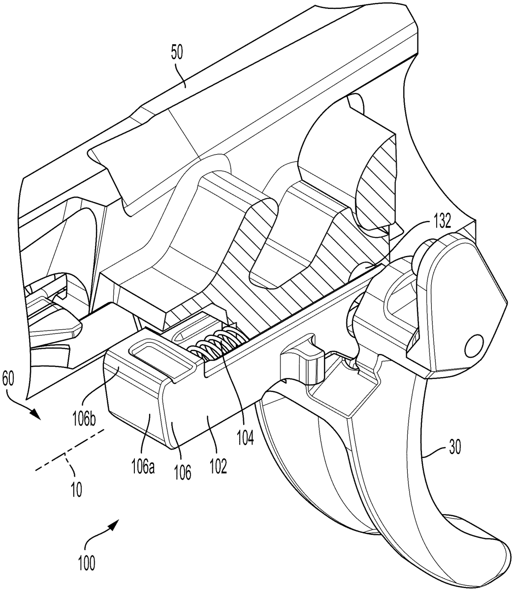 The patent describes a magazine disconnect mechanism for firearms that prevents the trigger from being pulled when the magazine is not installed. This mechanism includes a movable trigger block that obstructs the trigger’s movement when the magazine well is empty, ensuring safety by preventing accidental discharge.