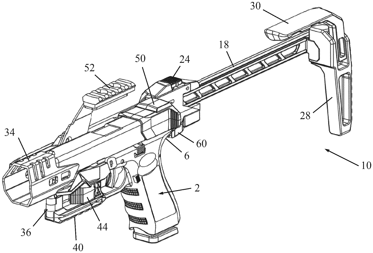 The patent describes a pistol stabilizer platform that features a platform member with multiple mounting provisions, designed to secure a handgun by clasping its forward portion and supporting its rear grip. This platform is uniquely positioned on one side of the handgun and includes an extendable rear buttstock rail for added stability.