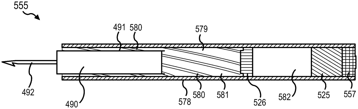 The patent describes a cartridge designed for a conducted electrical weapon, featuring a body with an inner surface that includes grooves extending from one end to a specific location, while the other end has a smooth surface. A piston within the cartridge is intended to move forward upon deployment and stop near the grooves, allowing the forward portion of the piston to be encircled by these grooves.