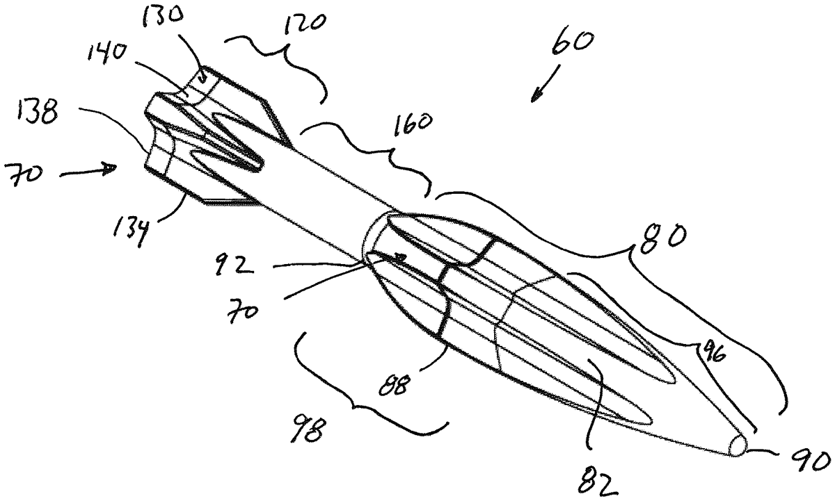 The patent describes a cartridge designed for firearms that features a projectile with a unique configuration, where the center of pressure is positioned rearward of the center of mass to enhance ballistic stability. Additionally, the projectile incorporates flight control surfaces that interact with the barrel’s bore without the need for rifling or sabots, allowing for improved accuracy and performance.