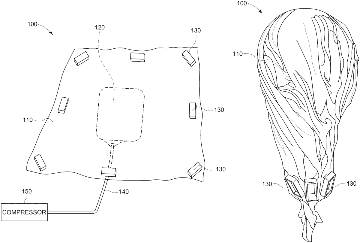 The patent describes a blast shield apparatus featuring a blast-resistant blanket equipped with magnets along its edge and a gas storage chamber. This design aims to enhance protection against explosive blasts by utilizing the blanket and chamber’s combined structural integrity.
