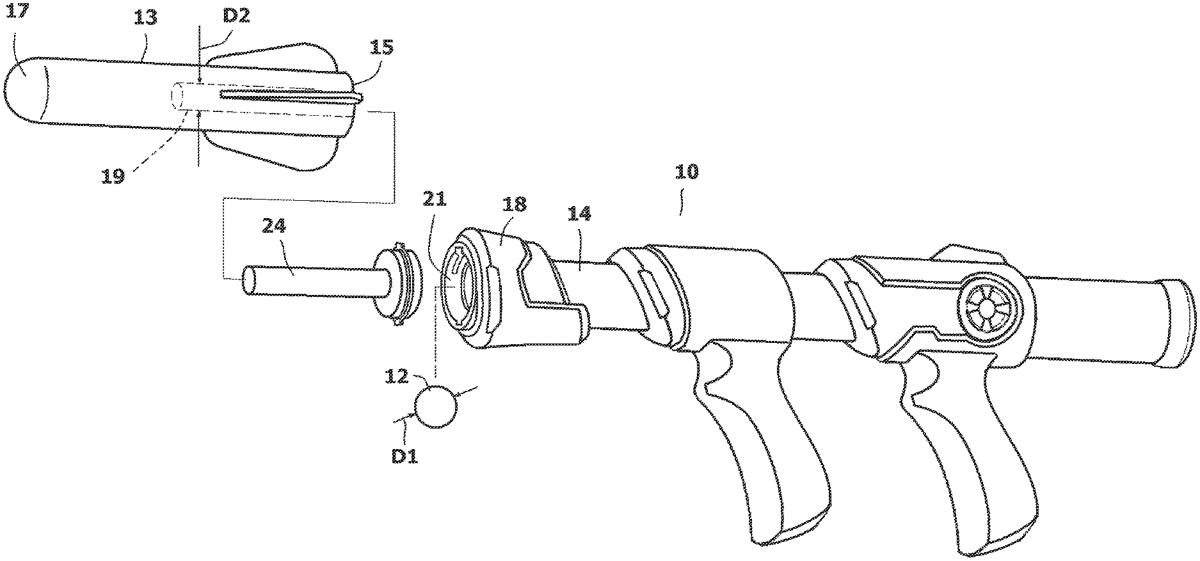 Improvements in a projectile launcher with a two-part bolt is disclosed. The two-part bolt has a forward bolt that moves and locates the projectile from the magazine to the breach. The ball is maintained in the breach until pressurized air pushes the projective out of the launcher. A ball holder is biased by a spring and when the bolt is moved, the bolt will lift the ball holder and blocks loading of a second projectile. An adjustable barrel detent alters pressure on top of the projectile to create backspin. The two bolt parts forms a piston to drive the projectile forward. A spring between the forward bolt and the rear bolt to maintains an extended biased location between the two bolt components. Travel between the two bolt elements if maintained by a pin that is retained in the rear bolt with a pin keeper spring.