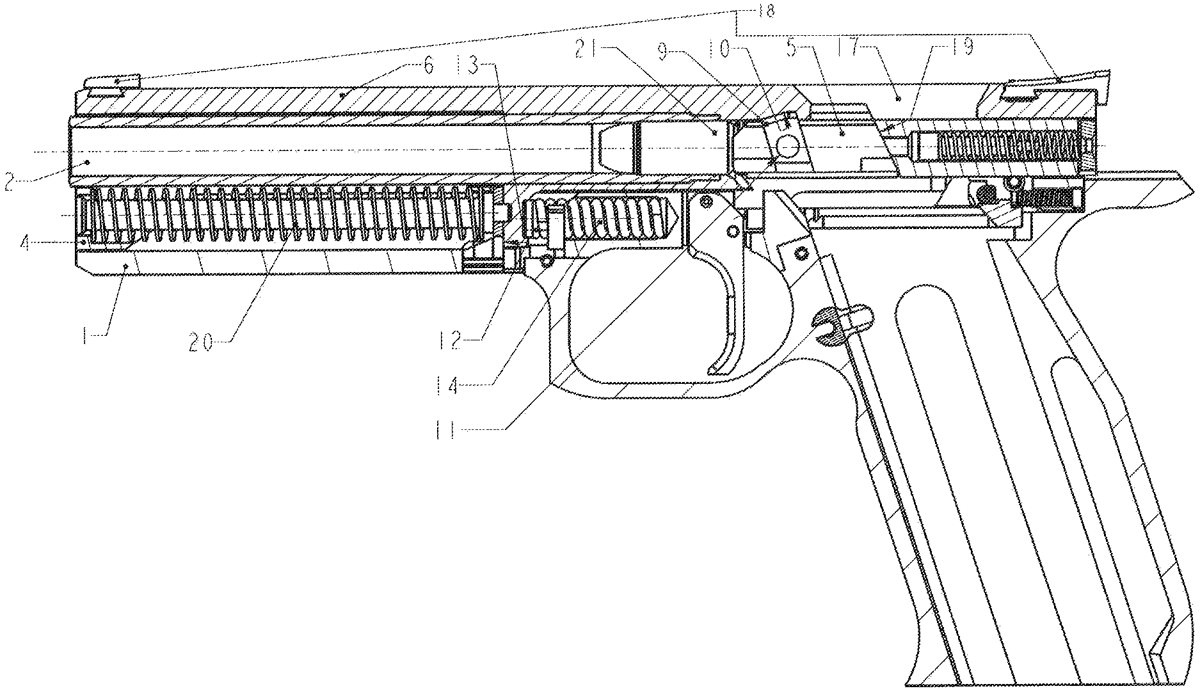 A firearm, comprising a frame ( 1 ) in which a breech block carrier ( 4 ) is arranged, as well as a barrel ( 2 ) behind the rear face ( 3 ) of which the breech block ( 5 ) is arranged in the frame ( 1 ). The barrel ( 2 ) is firmly connected to a barrel sleeve ( 6 ). The barrel sleeve ( 6 ) is slidingly mounted in a linear guide in the frame ( 1 ). The breech block ( 5 ) is mounted behind the rear face ( 3 ) of the barrel ( 2 ) slidingly in the direction of the barrel ( 2 ) axis. The breech block carrier ( 4 ) is slidingly mounted in a linear guide in the frame ( 1 ). On the top side of the breech block ( 5 ), a vertically movable locking block ( 9 ) is arranged, and the locking block ( 9 ) can be introduced into a recess ( 10 ) in the barrel sleeve ( 6 ). The frame ( 1 ) is provided with a front stop ( 12 ) of the barrel sleeve ( 6 ) and a rear stop ( 13 ) of the barrel sleeve ( 6 ). The barrel sleeve ( 6 ) is provided with a front stop ( 15 ) of the breech block ( 5 ), and a rear stop ( 16 ) of the breech block carrier ( 4 ). A barrel spring ( 14 ) is arranged between the frame ( 1 ) and the barrel sleeve ( 6 ).