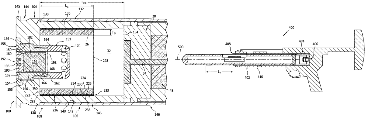 A cartridge ( 20 ) has a cartridge case ( 22 ) extending along an axis ( 500 ) from a base ( 104 ) to a mouth ( 102 ) and having an interior. A projectile ( 24 ) is mounted in the case. A propellant ( 26 ) is contained within the case. The propellant has an annular grain encircling the axis.