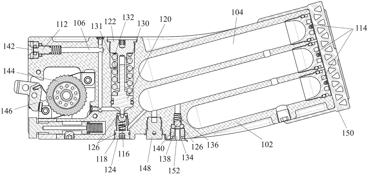 A high-pressure air magazine with an outer housing, a high-pressure chamber formed within the outer housing, a fill valve disposed between the high-pressure chamber and a fill port, and an air regulator configured to selectively pass air from the high-pressure chamber to a low-pressure chamber within the outer housing. The air regulator has a regulator ball valve positioned between the high-pressure chamber and the low-pressure chamber. A spring biases the regulator ball valve to a closed position. A regulator valve screw is configured to adjust a magnitude of the bias on the regulator ball valve. A regulator piston in contact with the regulator ball valve is configured to push the regulator ball valve to an open position when pressure within the low-pressure chamber lowers past a predetermined pressure. A regulator piston support nut is configured to adjust the predetermined pressure.