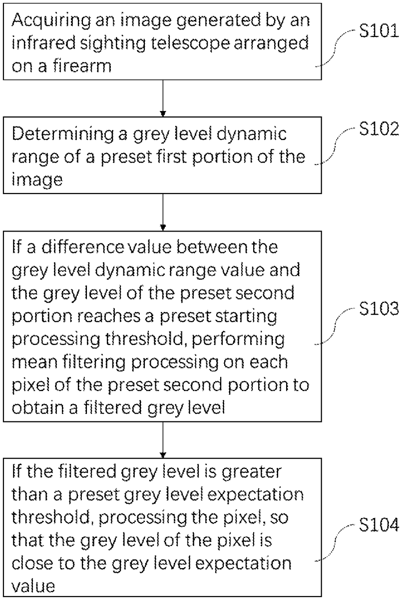 A method and device for image processing, a terminal and a storage medium. The method includes acquiring an image generated by an infrared sighting telescope arranged on a firearm; determining a grey level dynamic range of a preset first portion of the image; if a difference value between the grey level dynamic range value and the grey level of the preset second portion reaches a preset starting processing threshold, performing mean filtering processing on each pixel of the preset second portion to obtain a filtered grey level; and if the filtered grey level is greater than a preset grey level expectation threshold, processing the pixel, so that the grey level of the pixel is close to the grey level expectation value.