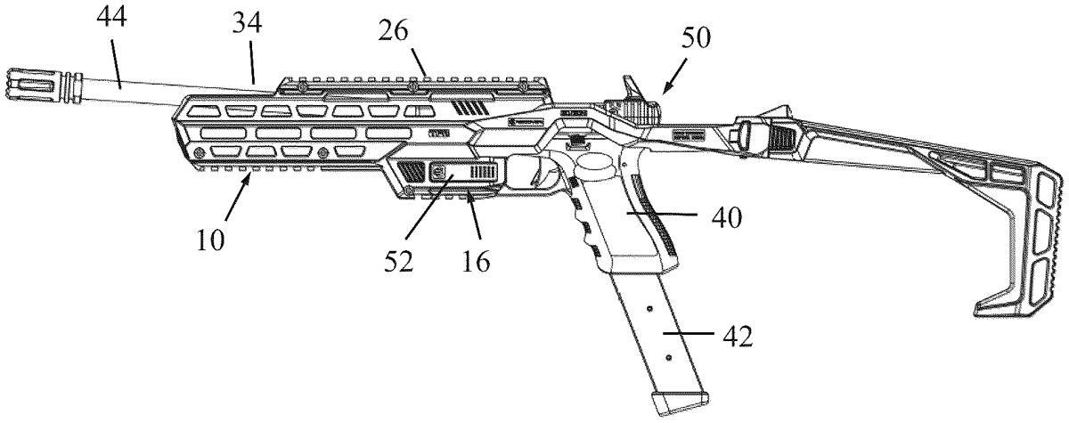 A weapon accessory includes a barrel shroud that has left and right side walls from which rearwardly extends an attachment member. An upper member extends between upper portions of the left and right side walls. The upper member does not extend to a distal end of the barrel shroud, and instead a distal opening is left between the upper portions of the left and right side walls. This distal opening accommodates barrel tilt of a barrel extension.